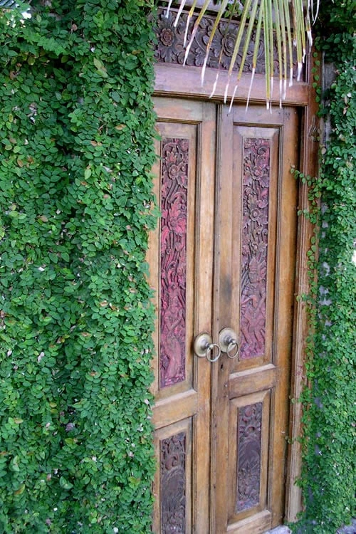 Creeping Fig can be used as a groundcover, but is most often used as an enthusiastic climber able to scramble up brick, stone or stucco walls up to 3 to 4 stories tall. This vine coats surfaces with a tracery of fine stems that are densely covered with small heart shaped leaves that are 1 inch long by about .75 in wide. They are held closely to the surface creating a mat of foliage that extends barely 1 in from the surface.