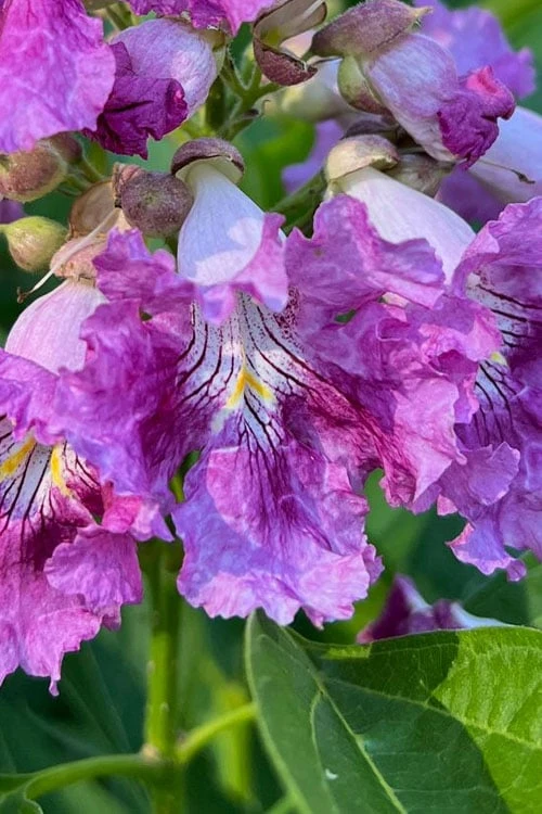 An intergeneric hybrid of desert willow (Chilopsis linearis) and catalpa (Catalpa sp.). El Nino Desert Orchid thrives in a much wider range and is much easier to care for than either of its parents. It is tolerant to the poor soils and dry heat of the West, as well as the heat and humidity in southern climates. It features abundant clusters of absolutely beautiful, sweetly scented, orchid-like flowers in purple shades. Depending on your location the flowers start coming in late spring to early summer and continue sporadically through the summer. Destined to be a lovely asset in the landscape, and a conversation piece for sure, at 6 to 8 feet tall and 5 to 6 feet wide El Nino is a fine accent in small to medium size spaces or in groupings where space will allow, though we do suggest spaced groupings so that each plant stands out on it’s own. That said, you can create a hedge with it if you like, or remove lower branches to form a small tree, or grow it in a container. The choice is yours!